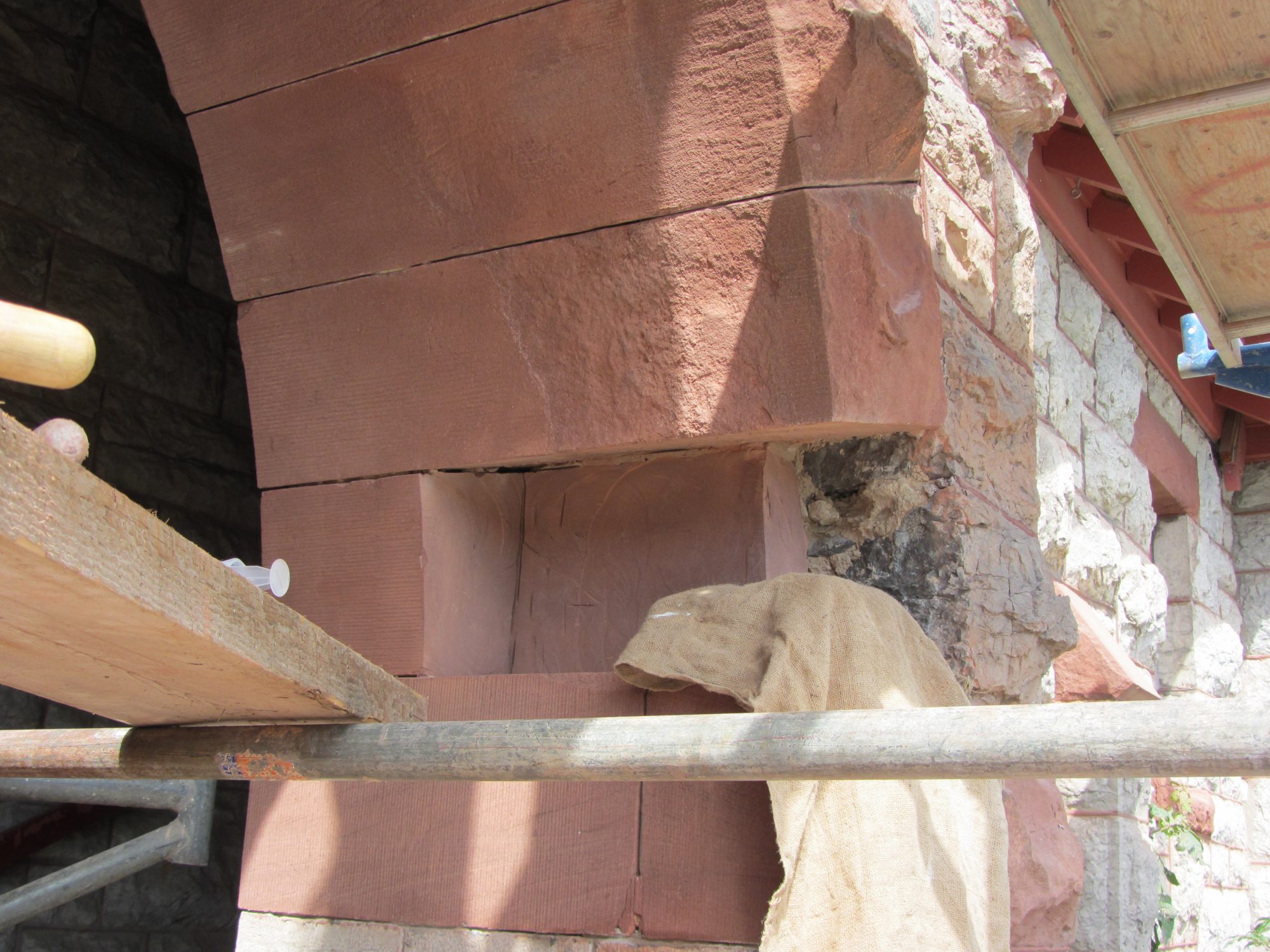 Partial stone replacement: a section of the the deteriorated voussoir (arch stone) was removed and replaced with a stone cut to match.
